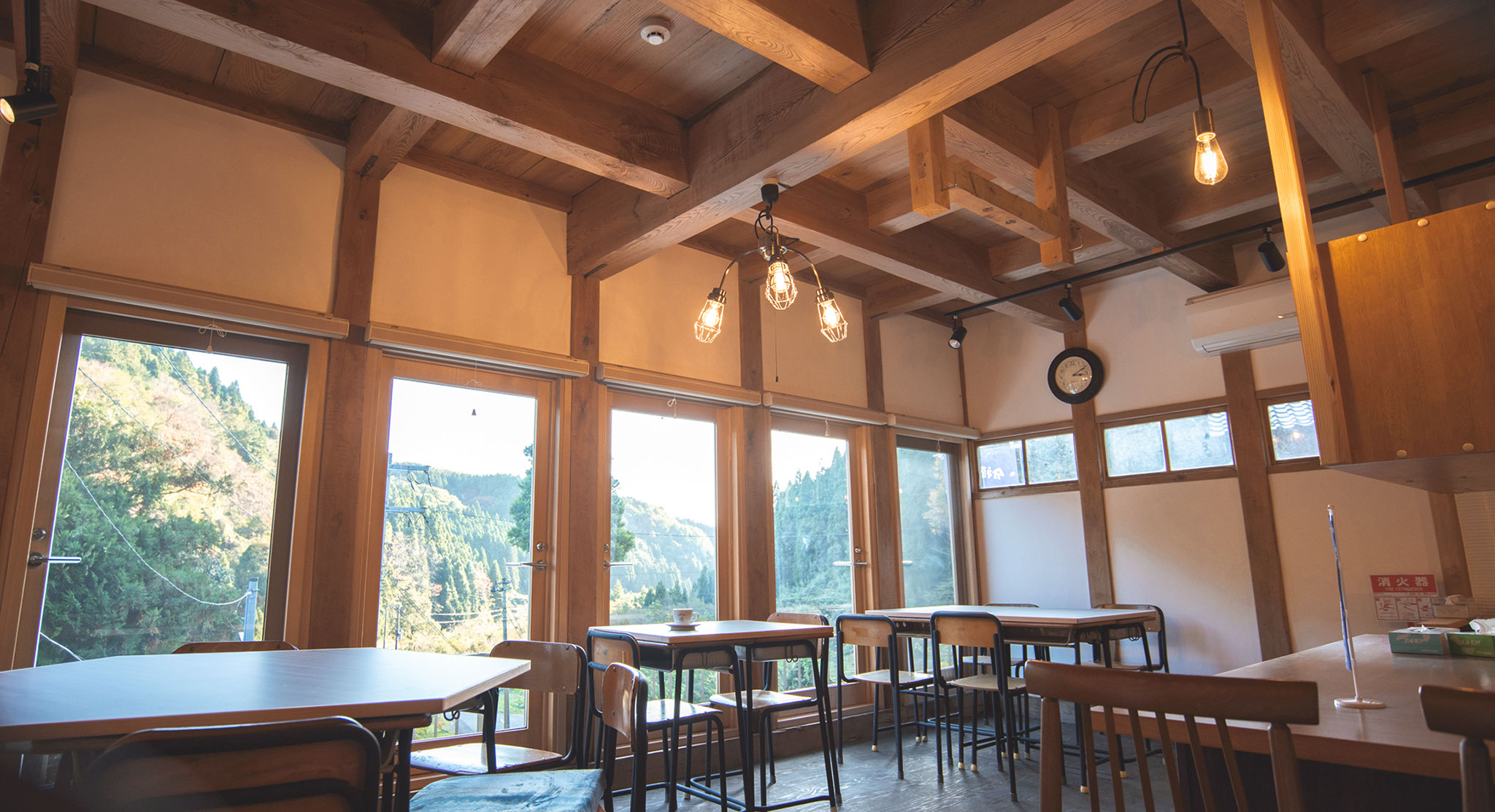 築270年以上の古民家の隣にある蔵を改装しカフェにしました。高台に建つカフェから里山の全景を眺める事ができ、ゆっくりとくつろげる空間に仕上げました。