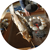 古民家岩穴は一組貸し切りのゲストハウスです。リフォームされたキッチンを完備していますので、お好きな食材を持ち込み調理して、囲炉裏を囲み食事ができます。また、能登の山の幸、海の幸をテークアウトして囲炉裏で調理することもできます。囲炉裏火の扱いや調理は担当者がお手伝いさせていただきます。ご用命ください。